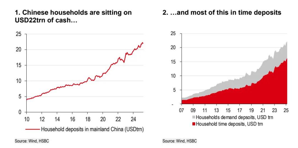 汇丰在6月2日发布的全球研究报告《What to do with RMB 160trn (USD22trn) in cash?》中指出,中国内地家庭持有 160 万亿元人民币现金(约 22 万亿美元),这相当于英国 + 法国住房总价值的总和(还有几千亿美元用于翻新)!