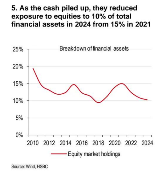 汇丰认为,这可能开始流入股票,因为 2024 年股票仅占中国家庭金融资产的 10%,远低于 2021 年的 15% 和 2010 年的 20%(见下图)。同样,这会是一个巨大的数额,规模相当于 A 股市场的一半。