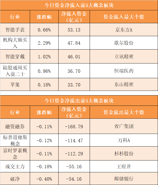 概念板块方面,今日智能手表、机构大额买入、智能穿戴等概念板块资金呈现净流入,其中智能手表概念净流入53.13亿元居首。