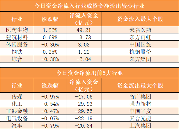 28个申万一级行业中,4个行业实现资金净流入,其中医药生物行业净流入49.21亿元居首。