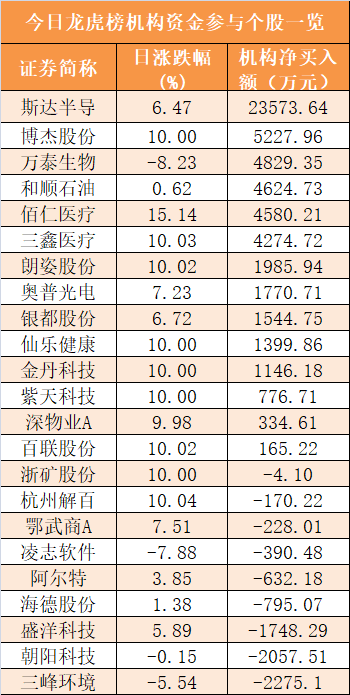 盘后龙虎榜数据显示,机构现身23股,其中斯达半导等14股呈现机构资金净买入,三峰环境等9股呈现机构资金净卖出。
