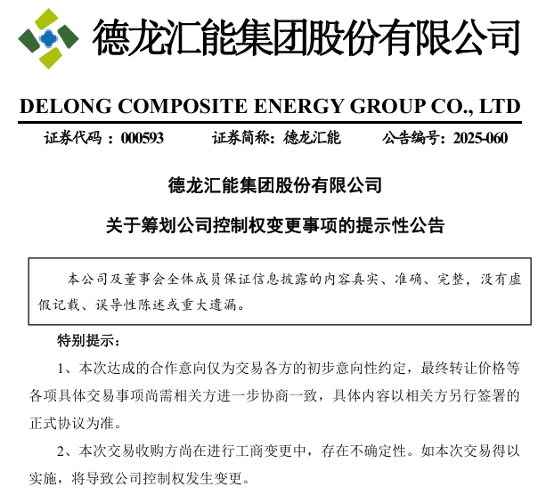德龙汇能(000593)10月24日公告,公司控股股东北京顶信瑞通科技发展有限公司与东阳诺信芯材企业管理合伙企业(有限合伙)(下称“诺信芯材”)签订了《股份转让之意向协议》,拟将其持有公司29.64%股份转让给诺信芯材,(交易)可能导致公司控制权发生变更。目前,各方主体正在就具体交易方案、协议等相关事项进行磋商,尚存在重大不确定性。