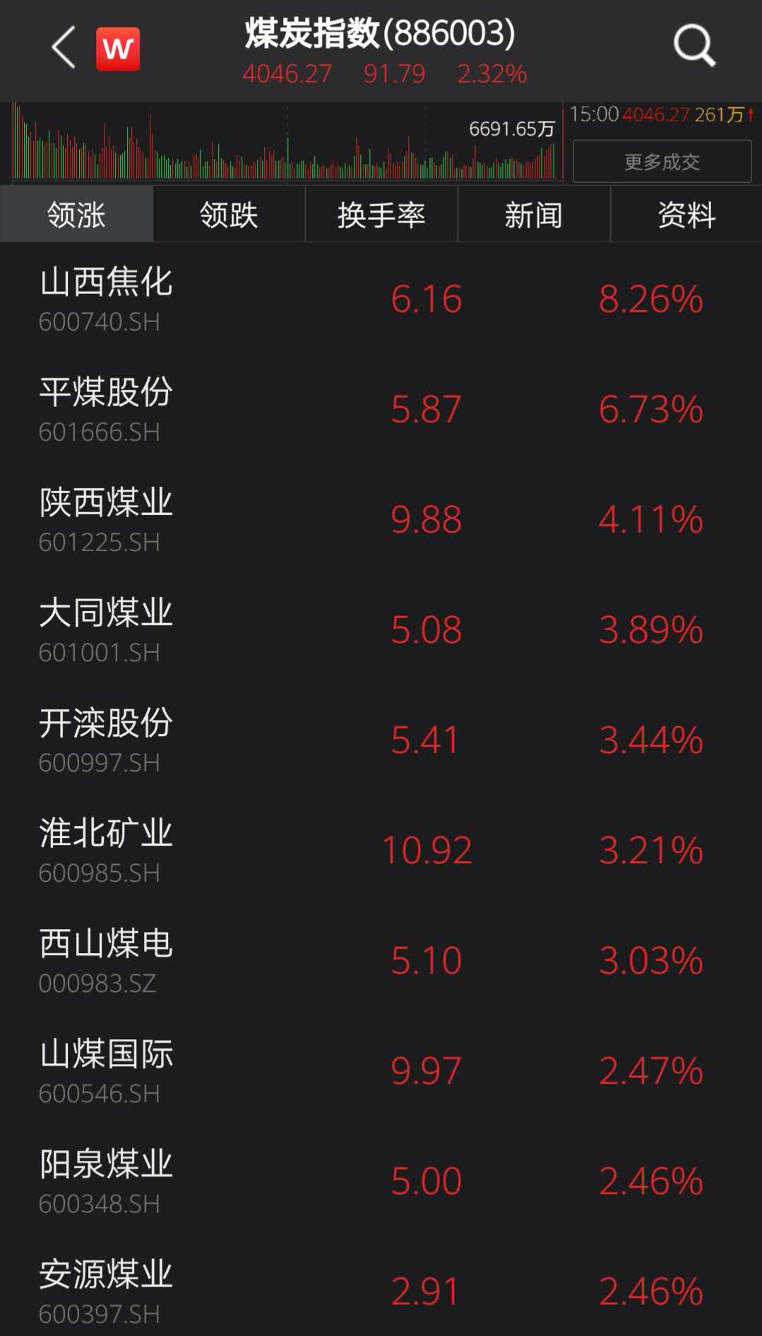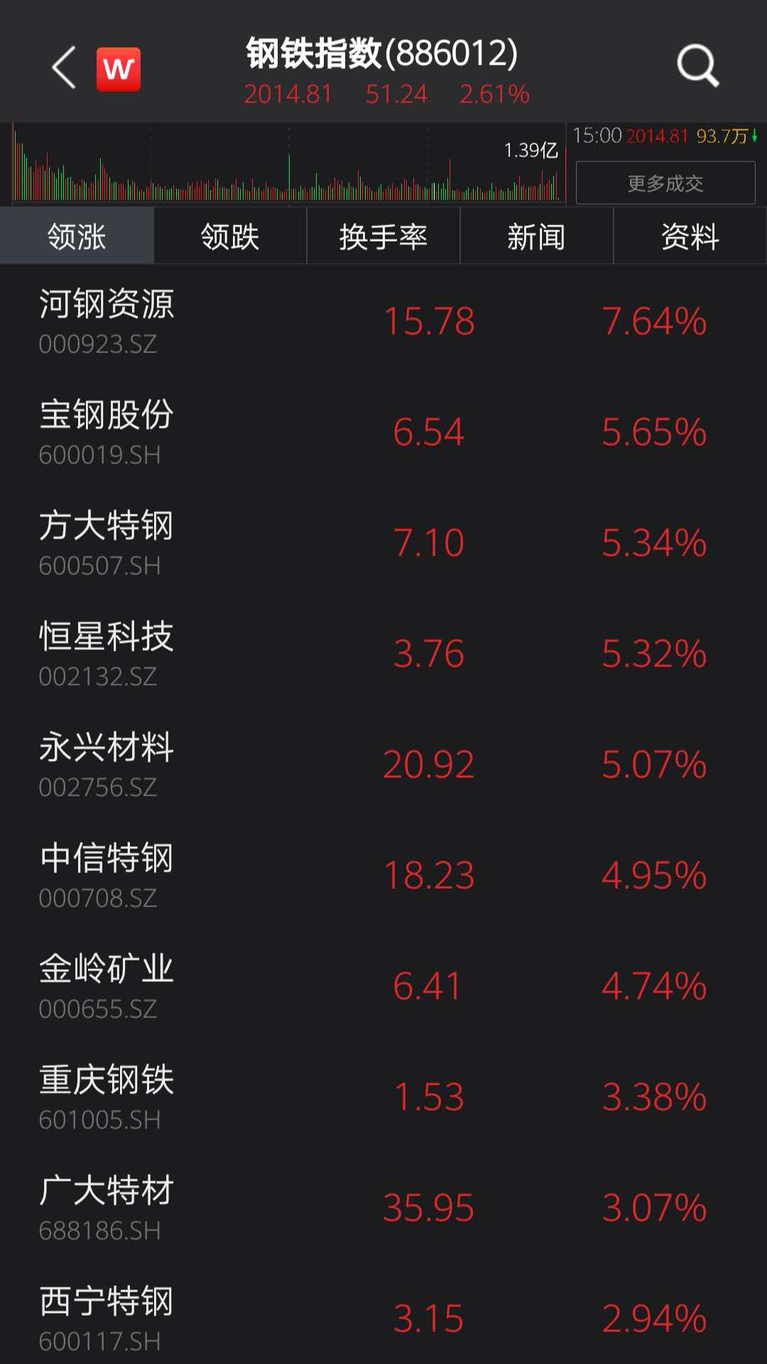 Wind数据显示,截至收盘,钢铁指数涨2.61%。个股中,河钢资源以7.64%涨幅领涨,宝钢股份、方大特钢、恒星科技、永兴材料涨幅均超5%;煤炭指数涨1.04%,个股中,山西焦化以8.26%涨幅领涨,平煤股份涨逾6%,陕西煤业涨4.11%。