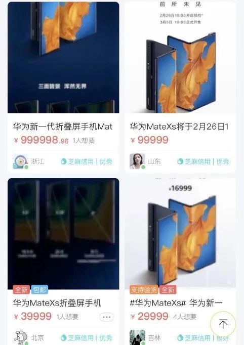 因此,华为 Mate Xs预约一放开,便有人在闲鱼上发布该机的转卖及代拍信息,最高标价已近100万元。