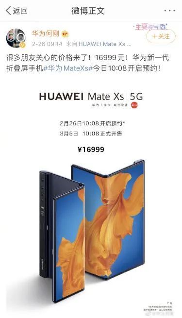 2月26日一早,华为消费者业务手机产品线总裁何刚发微博称:“很多朋友关心的价格来了!16999元!华为新一代折叠屏手机华为 Mate Xs今日10:08分开启预约!”