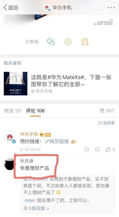 在华为手机官微预约微博下,有网友留言戏称华为 Mate Xs为“年度理财产品”。