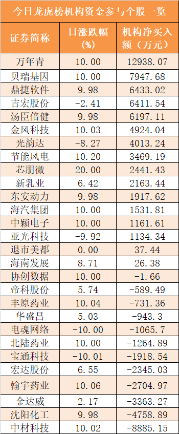 盘后龙虎榜数据显示,机构现身28股,其中万年青等16股呈现机构资金净买入,中材科技等12股呈现机构资金净卖出。