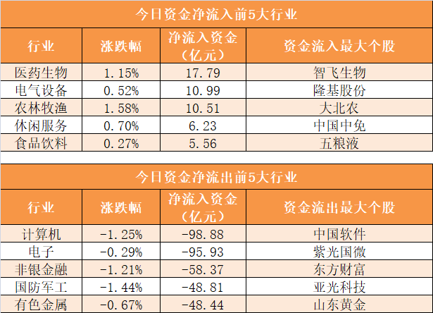 28个申万一级行业中,7个行业实现资金净流入,其中医药生物行业净流入17.79亿元居首。