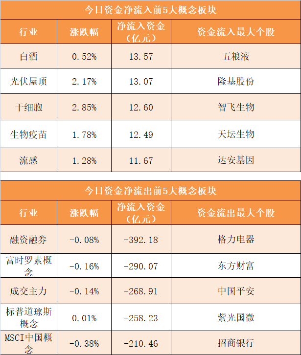 概念板块方面,今日白酒、光伏屋顶、干细胞、生物疫苗等概念板块资金呈现净流入,其中白酒概念净流入13.57亿元居首。
