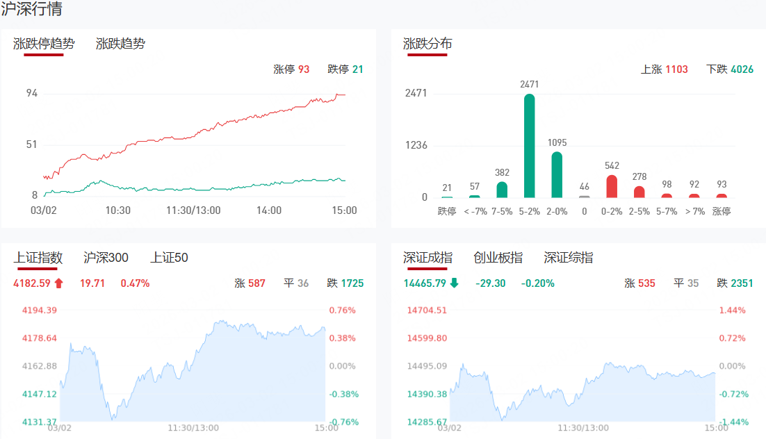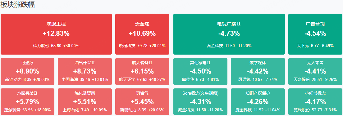 三大指数涨跌不一,沪指低开高走涨0.47%,创业板指冲高回落,盘中一度翻红。黄白线明显分化。沪深两市成交额3.02万亿,较上一个交易日放量5327亿。盘面上,全市场超4200只个股下跌。从板块来看,油气股全线爆发,近二十只成分股涨停,洲际油气5天3板,中国石化尾盘集合竞价触及涨停,成交超74亿,此前中国海油、中国石油双双涨停,“三桶油”历史首次股价集体报收涨停;贵金属概念集体走强,晓程科技20cm涨停,西部黄金、四川黄金等多股涨停。化工板块反复活跃,金牛化工走出11天5板,金瑞矿业、红星发展、兴化股份涨停。港口航运概念表现活跃,中远海能、南京港、招商南油涨停。煤炭板块午后拉升,中煤能源触及涨停创17年新高。下跌方面,光伏设备概念集体下挫,双良节能一字跌停。
