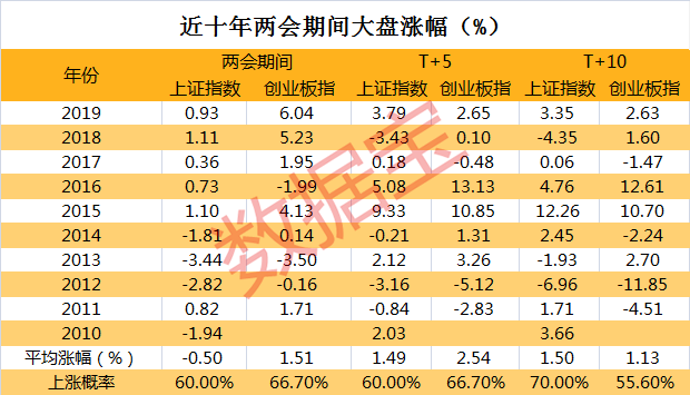 从历史数据来看,股市呈现出了一定的“两会效应”。证券时报·数据宝统计,过去十年中(2010~2019年),上证指数在两会期间共有6次上涨,近五年两会期间上证指数全部取得正收益。两会结束后大盘的上涨趋势仍短期延续,相关政策的出台形成的利好在会后持续发酵。在两会结束后5天和10天,大盘上涨概率分别达到60%和70%,且涨幅不断扩大。