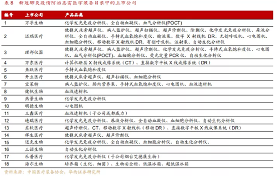 一是医疗设施建设:疫情推动医疗设施补足,加上未来新基建下医疗设备采购,推动医疗设施建设。疫情后对部分特定医疗设备的需求必定会大幅增加。在中国医疗装备协会颁布的新冠肺炎疫情防治急需医学装备目录中,涉及到18家上市公司,包括万孚生物、迈瑞医疗、理邦仪器、万东医疗、鱼跃医疗等。