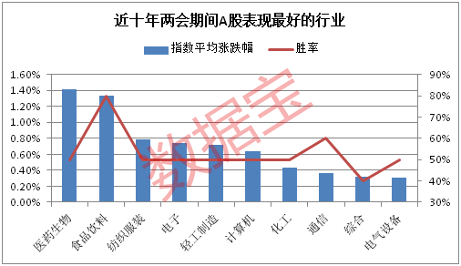 两会期间各行业的走势出现分化,多数行业表现较为平淡。数据宝统计,过去十年中,28个申万一级行业中仅有食品饮料和和通信行业在两会期间的胜率超过50%,分别达到80%和60%,食品饮料行业是绝对赢家。采掘、有色金属、交通运输等5个行业的胜率仅有30%。