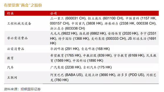 招银国际预测政府将继续广泛地支持内需及消费,同时针对性地推动基建投资和就业。历年数据显示,消费股在两会前后大多跑赢大市。考虑到今年的政策支持以及外围风险,今年消费股(包括零售、餐饮、汽车、教育、电商等)有望继续受惠两会,成为赢家。
