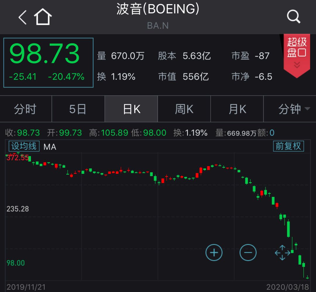 其中,全球最大飞机制造巨头—波音公司(BA)自2020年2月20日以来上演崩盘式暴跌,短短20个交易日,股价跌幅超过70%,其总市值更是蒸发高达1344亿美元(约合人民币达9408亿元),仅剩3913亿元,约等于0.3个贵州茅台。