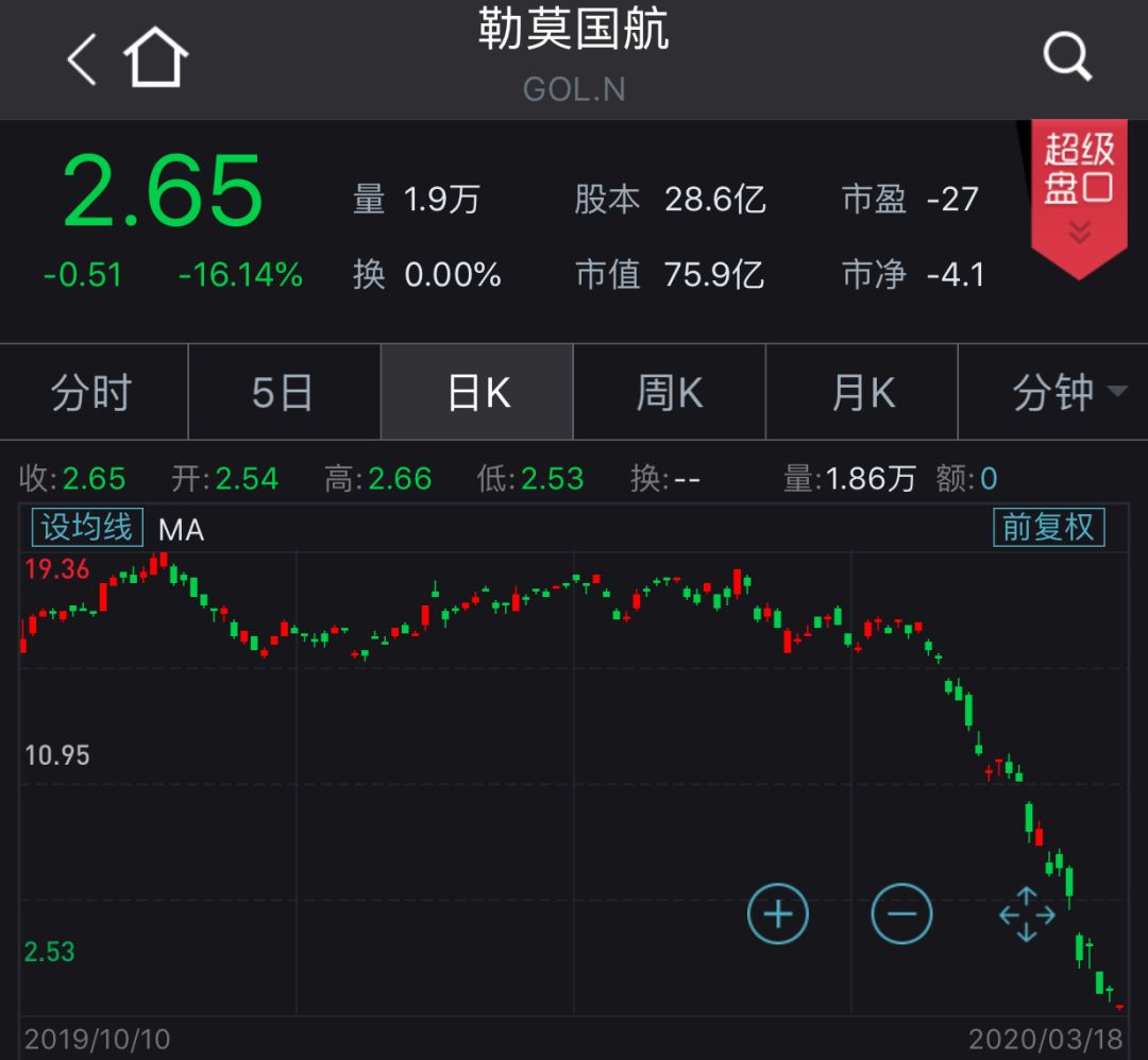 前途艰险的同时,恰逢美股不断上演史诗级暴跌,导致大部分美股上市的航空企业于2020年内的股价最大跌幅超过50%。其中,勒莫国航(GOL)尤为惨烈,股价已被腰斩2次,累计跌幅高达85%。