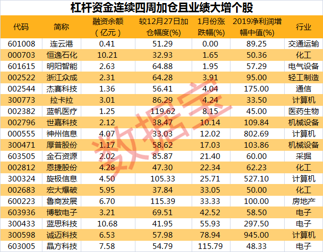 获杠杆资金加仓股中,有一批个股业绩较好,这份清单请收好。数据宝统计显示,截至当前连续四周获杠杆资金加仓,最新融资余额较去年末增幅超30%,且2019年度净利润增幅超30%的个股共有19只。