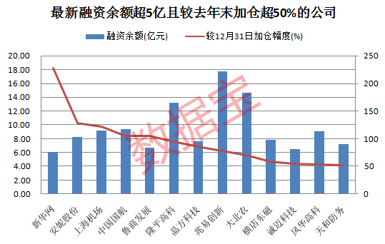 融资余额加仓幅度超50%的个股有97只,30股加仓幅度超过100%。医药股延安必康加仓幅度位居首位,最新融资余额2.62亿元,较去年末增加250.35%,延安必康是一家涉及医药、锂电池业务的医药公司,1月份以来股价累计下跌15.42%;其次是新华网,融资余额加仓超2.2倍;而红豆股份、珍宝岛、福成股份等股加仓幅度均超过150%。