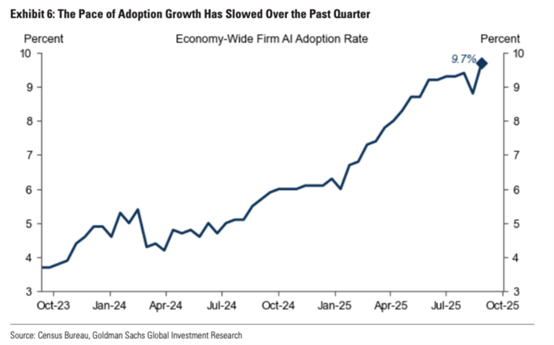 Hatzius表示,今年第三季度,美国企业的AI采用率为9.7%,高于第二季度的9.2%,但AI采用增长率有所放缓。