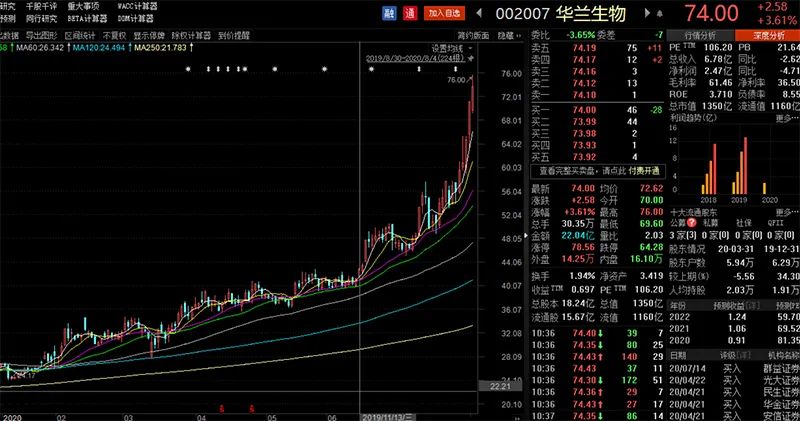 另外,从事血液制品研发和生产的华兰生物,同样涨势强劲。2020年初,其股价仅为26.87元(前复权价),昨日华兰生物涨停,今日继续上涨,年内涨幅逼近175%。
