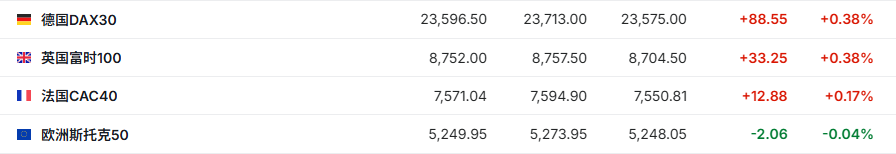 2. 截至发稿,德国DAX指数涨0.38%,英国富时100指数涨0.38%,法国CAC40指数涨0.17%,欧洲斯托克50指数跌0.04%。