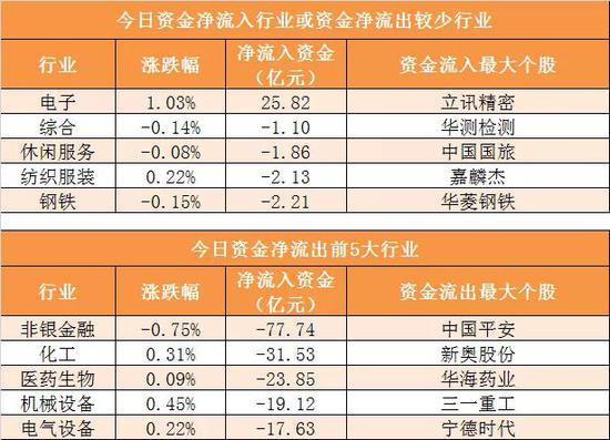 28个申万一级行业中,仅电子1个行业实现资金净流入,非银金融、化工、医药生物、机械设备等行业净流出规模居前,其中非银金融行业净流出77.74亿元居首。