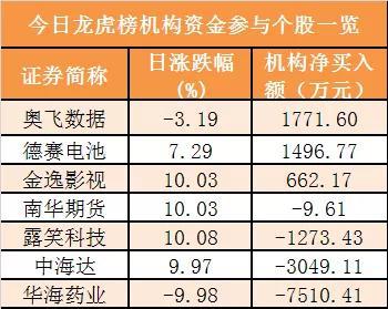 盘后龙虎榜数据显示,机构现身7股,其中奥飞数据等3股呈现机构资金净买入,华海药业)等4股呈现机构资金净卖出。