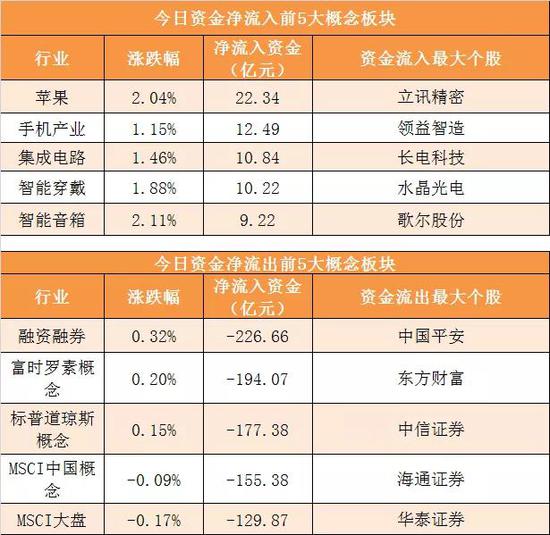 概念板块方面,今日苹果、手机产业、集成电路、智能穿戴等概念板块资金呈现净流入,其中苹果概念净流入22.34亿元居首。