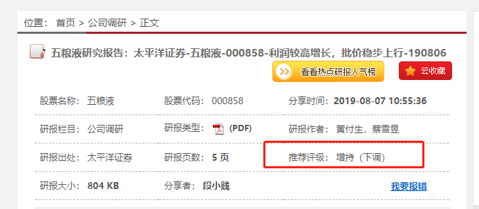 太平洋证券发布的五粮液最新研报,把五粮液由上次的买入评级调低至增持评级。根据太平洋证券研报附注投资评级说明显示,买入评级为预计未来6个月内,个股相对大盘涨幅在15%以上;增持评级为预计未来6个月内,个股相对大盘涨幅介于5%与 15%之间。