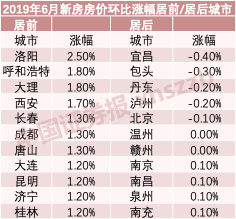 6月70个大中城市中,新建商品住宅销售价格环比上涨的有63个城市,较上月减少4个。其中,洛阳以2.5%的环比涨幅领跑,一线城市北京、上海、广州和深圳分别上涨-0.1%、0.3%、0.3%和0.5%。