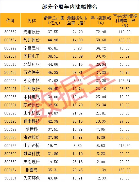 部分股票股价表现较为出色。其中,光莆股份年内大涨72.98%位居涨幅榜首位。利民股份大涨58.68%位居涨幅榜次席,宁夏建材和奥拓电子涨幅均超过30%,北陆药业、五洋停车、浙商中拓等多只个股涨幅超过20%。逆市下跌的股票只有先河环保和报喜鸟,跌幅均在3%以内。
