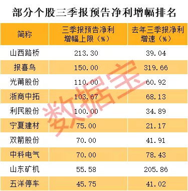 从过去两年三季报净利增速方面,最显眼的就是山东矿机和博世科两只股票,此前两年三季报净利增速均超过100%,其中山东矿机更是超过200%。前两年净利增速均超过50%的股票则有报喜鸟、中科电气和红相股份。从今年三季报预告来看,山西路桥、报喜鸟、光莆股份、浙商中拓、利民股份等个股预告净利增速上限均在100%以上。