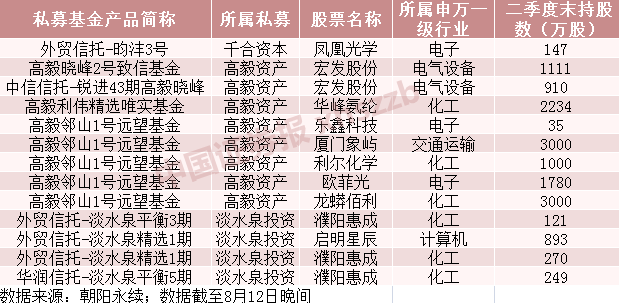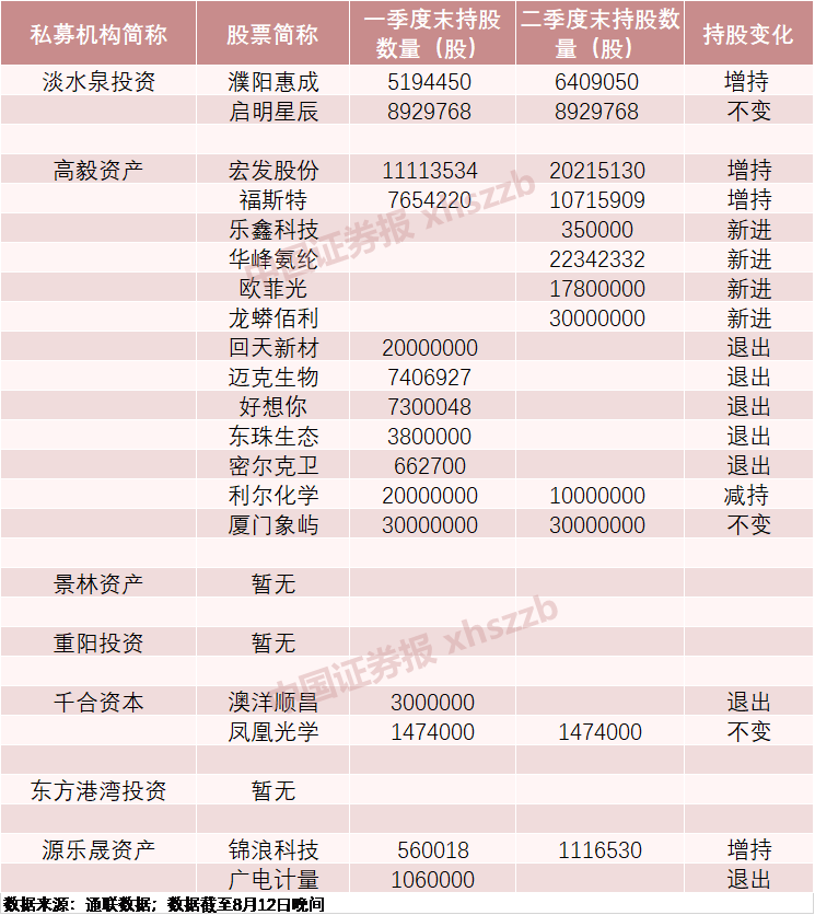 截至8月12日,淡水泉投资、高毅资产、景林资产、千合资本、重阳投资、东方港湾投资、源乐晟资产等7家知名头部股票私募,共计上榜了12家上市公司前十大流通股东的名单。