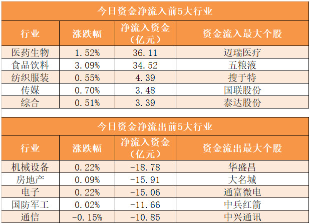 28个申万一级行业中,8个行业实现资金净流入,其中医药生物行业净流入36.11亿元居首。