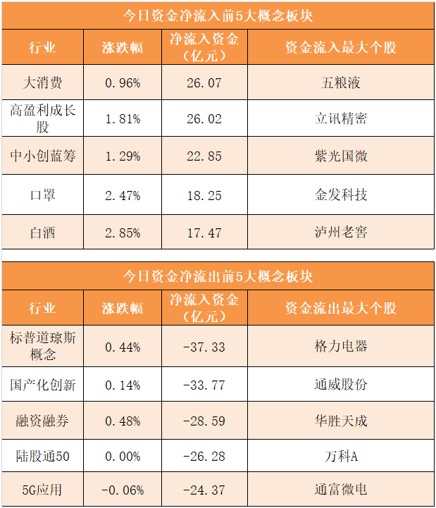 概念板块方面,今日大消费、高盈利成长股、中小创蓝筹、口罩等概念板块资金呈现净流入,其中大消费概念净流入26.07亿元居首。