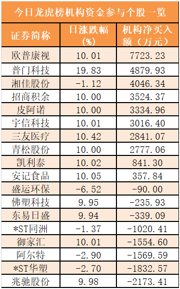 盘后龙虎榜数据显示,机构现身18股,其中欧普康视等10只股票呈现机构资金净买入,兆驰股份等8股呈现机构资金净卖出。