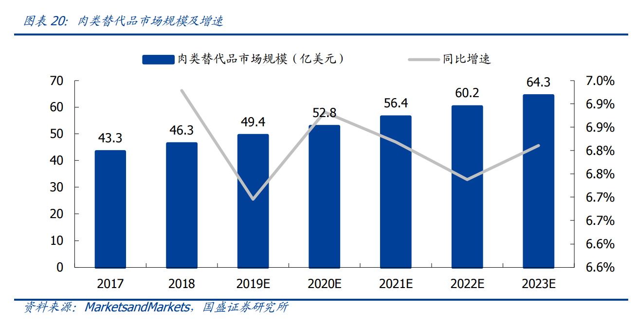 根据MarketsandMarkets数据显示,预计到2023年,全球肉类替代品市场规模将达到64.3亿美元,2018-2023年GAGR为6.8%,其中,亚洲肉类替代品市场规模增长速度最快,预计GAGR可达8%以上。