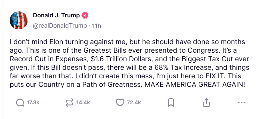 "我不介意埃隆反对我,但他应该在几个月前就这么做,"特朗普写道,随后他话锋一转强调其力推的“大而美”法案的好处,称"这是提交给国会的最伟大法案之一。"