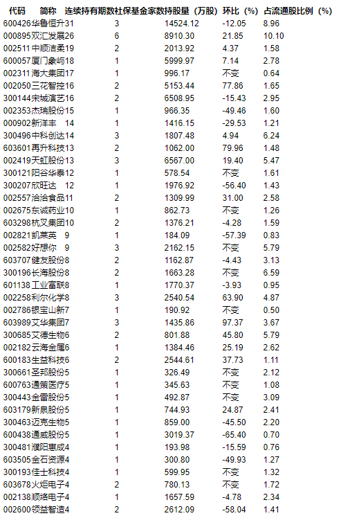 社保基金持有期限最长的个股是华鲁恒升,自2012年四季度以来已累计持有31个季度,最新全国社保基金一零八组合、全国社保基金一零六组合、全国社保基金一一七组合,位列公司第三大、第四大、第七大流通股东,持股量合计为1.45亿股,占流通股比例为8.96%,社保基金持有期限较长的还有双汇发展、中顺洁柔(002511)、厦门象屿(600057)等,已连续持有26、19、18个季度。