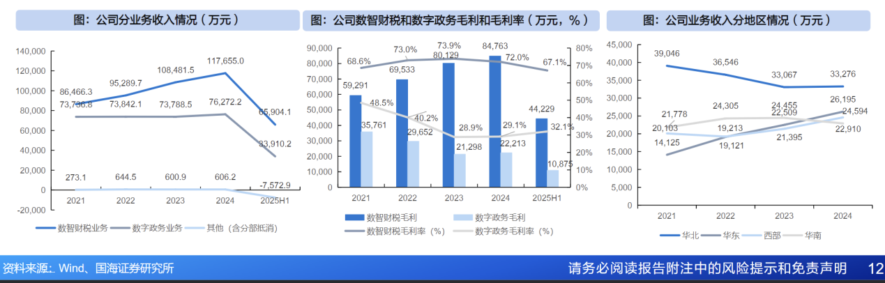 数字政务业务:是公司的起家业务,主要为税务机关等政府部门提供税务系统开发与运维服务,深度参与金税三期、金税四期等国家级重大项目。近年来,该业务正从传统的项目制向高毛利的数据价值服务转型,拓展至人社、财政等领域。2025年上半年,该业务实现收入3.00亿元,同比增长16.60%,是过去三年增速最快的业务之一。