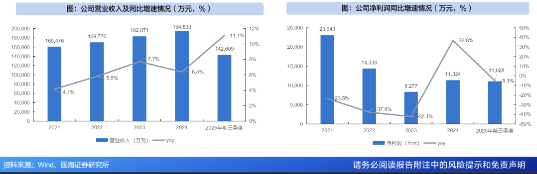 公司收入水平稳定增长。公司营业收入稳定增长,2021-2024年公司营收从16亿元稳步增长至19亿元,CAGR为6.6%;2025年Q1-Q3营业收入14亿元,同比增长11%。