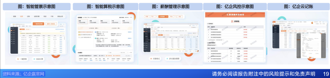 模化推广;在经营赋能层,通过大模型驱动的财经分析Agent,整合企业经营数据生成智能报告,辅助成本优化、投融资决策等战略层面需求。此外,亿企赢积极探索多模型生态,引入 DeepSeek、通义Qwen、OpenAI 等开源模型优化坐席咨询与运维场景,形成“垂域人工智能平台+通用模型+垂直场景”的技术矩阵。三层体系的协同创新,不仅降低了企业数字化门槛,更推动财税服务从被动响应向主动创效转型,为行业树立了“AI+财税SaaS”的应用标杆。据公司2024年年报,AI产品占数智财税业务收入贡献中的比例已超过20%。