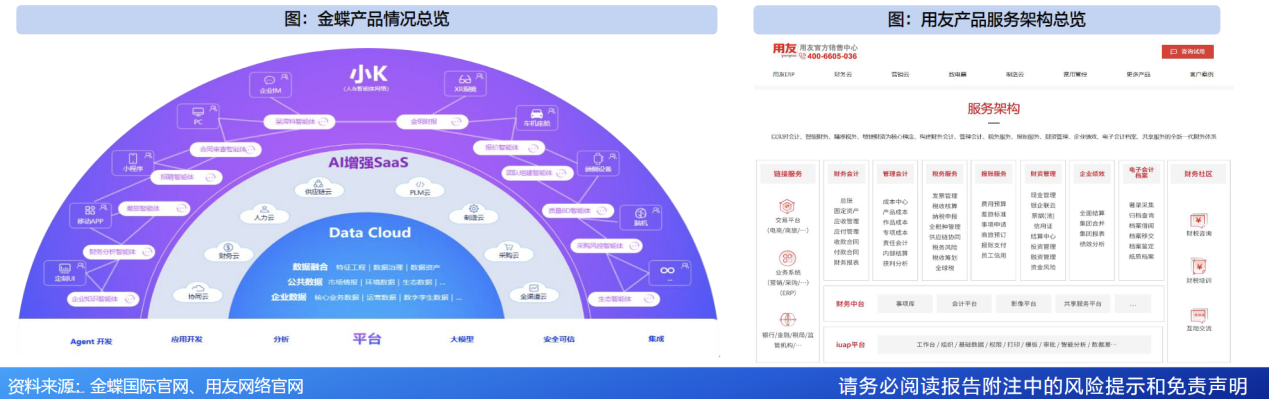 据用友网络2025半年报,公司面向大型企业(包括超大型企业和一般大型企业)提供用友数智商业创新平台(用友BIP)产品与服务,BIP定位为数智商业应用平台、应用软件与服务,聚焦数智平台及十大领域的场景服务。面向成长型企业提供基于用友BIP平台的YonSuite云服务产品提供“平台、财务、人力、营销、采购、供应链、制造、资产、项目、协同”融合一体化的公有云服务包。聚焦小微企业数智财税和数智商业两大领域,全面打通小微企业的人、财、货、客管理。