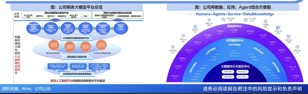 公司数据价值服务开拓持续推进。税费数据要素为全量数据,体量大、质量优质、覆盖全面,是政务大数据重要组成部分。随着我国新经济业态持续创新,以数据驱动的综合治理、公共服务、税费治理等模式同样需要迭代创新。公司依托“犀友”人工智能平台,构建垂域大模型、垂域知识中心、垂域 AI 产品生态,更好地为客户提供数据价值服务,提升政府治理效率。①在税务客户市场:目前公司已形成风险、稽查、信用、征管和基础