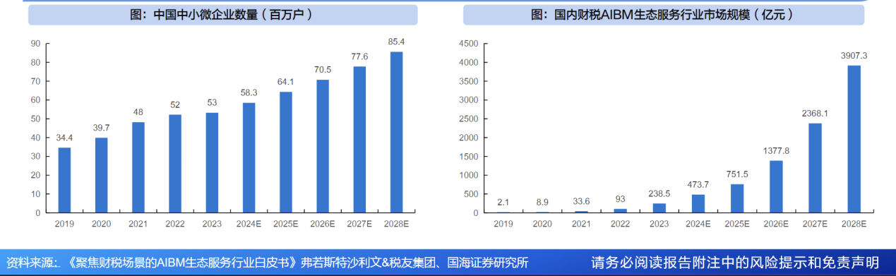 B端业务市场空间:中小企业数量众多,AIBM行业增量广阔。u 我国企业主体数量庞大,据弗若斯特沙利文&税友集团发布的《聚焦财税场景的AIBM生态服务行业白皮书》,中国中小微企业数量从2019年的约3,440万家逐步增长,到2023年达到5,300万家,呈现出较快的增长速度。2019年至2023年期间,中小企业的年均增长率约为11.4%,显示出中小微企业在这段时间内的快速发展。这一增长趋势反映了中国中小微企业在经济中的重要性,特别是在推动创新、创造就业和促进经济多样化方面的作用。