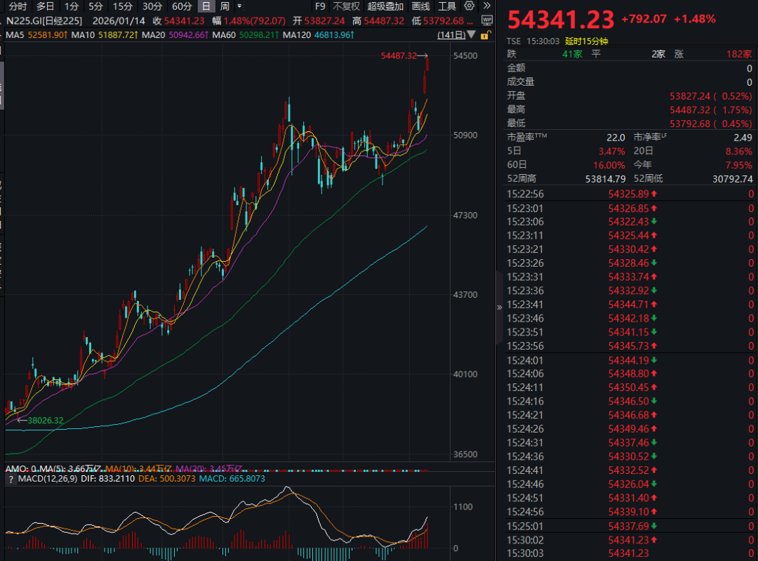 今日(1月14日),日本股市高开高走,日经225指数突破54000点,再创历史新高。截至收盘,日经225指数涨幅接近1.5%。