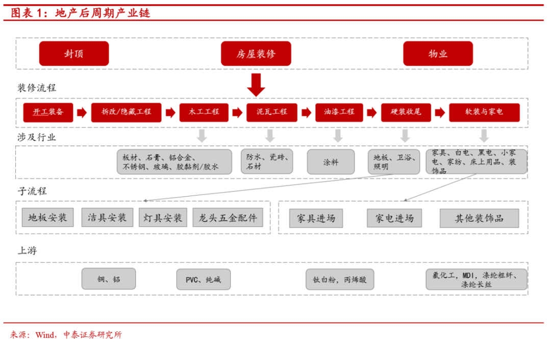 地产后周期,又被称为竣工周期。从竣工开始后各行业的入场顺序看,竣工首先从封顶开始,涉及玻璃、电梯;然后装修阶段拉动板材、涂料、石膏板等行业消耗,交房后家电、家具、家纺(床上用品)、装饰品等行业的需求明显上升。此外,值得关注的是下游产品的变化还间接拉动了产业链上游有色、化工等行业的发展。