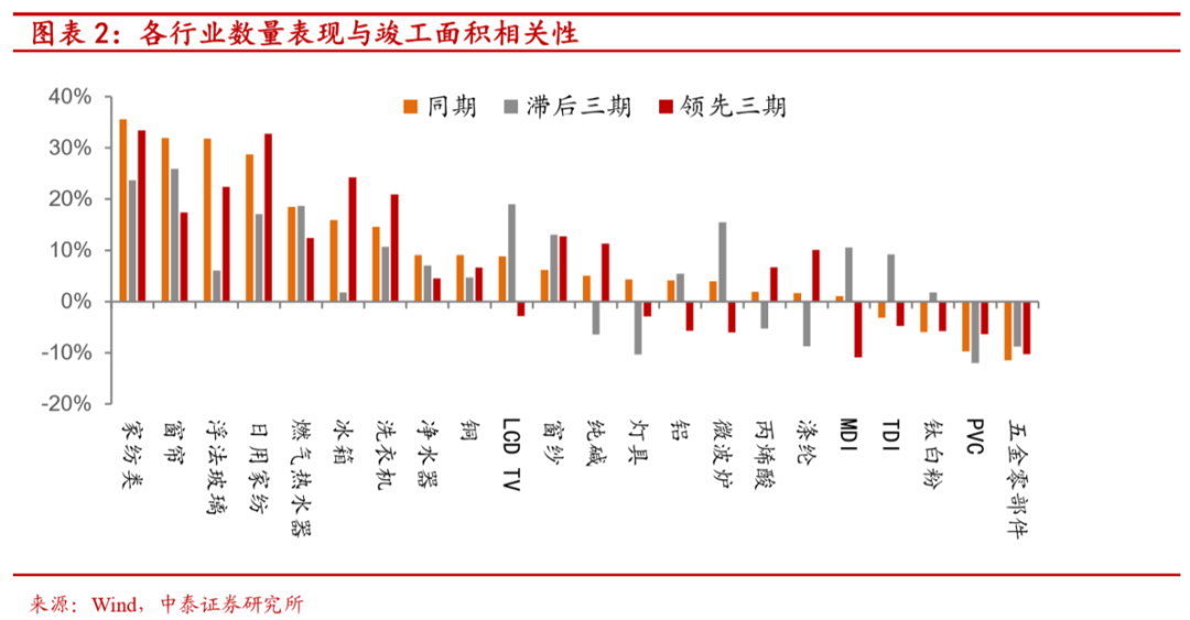 从整体来看,无论数据是否滞后或领先,地产后周期对下游商品的拉动程度要高于上游原材料。具体来说,房地产竣工面积增速与窗帘等家纺类、浮法玻璃、燃气热水器等正相关性较为明显,与丙烯酸、铝、TDI、钛白粉等上游原材料相关性整体低,与PVC、五金零部件价格呈现出弱负相关性。