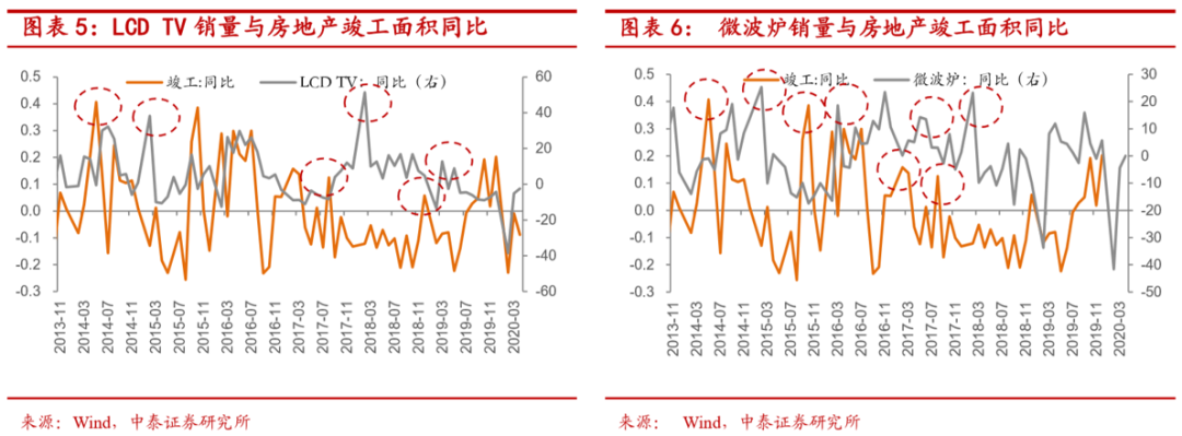 考虑到地产后周期涉及的子行业众多且入场时间有先后差别,为了更清晰地展示出不同子行业与地产竣工之间的联系,我们基于2010年至2020年期间的相关数据进行分析,以月度频率的变化,估算竣工面积与商品销量间的关系,并总结出以下值得关注的特征。