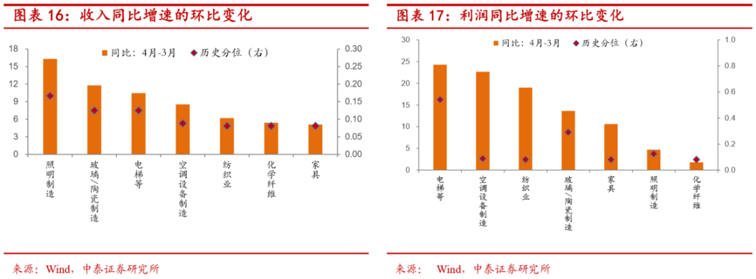 具体来说,收入方面:虽然多数行业的增速仍然处于历史低位,但是从同比增速的环比变化看,4月照明、玻璃/陶瓷、电梯、空调行业已经出现大幅改善迹象。
